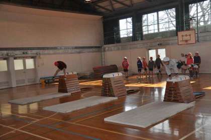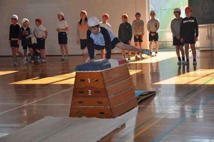 開脚跳びの練習中です。手のつき方、安全のための注意事項を確認したあとで練習を始めました。
