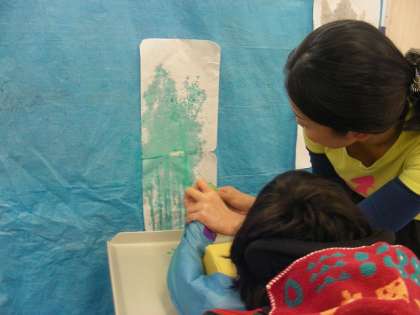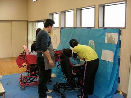 風船の中に水を多めに溶かした絵の具を入れて、画鋲で穴を開けて水鉄砲のようにして飛ばしました。