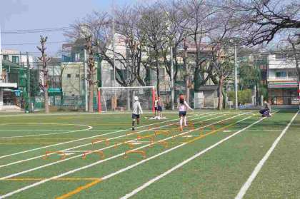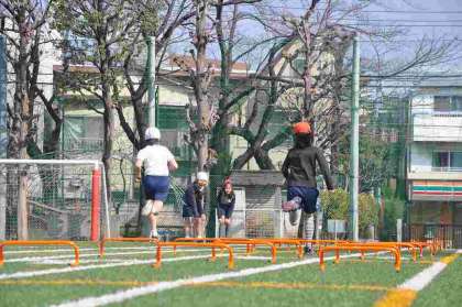お昼前に天気が回復しました。人工芝の上にミニハードルを置いて走ったタイムを測定しています。