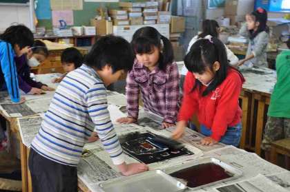下絵にローラーでインクを付けていきます。むらなく塗っています。
