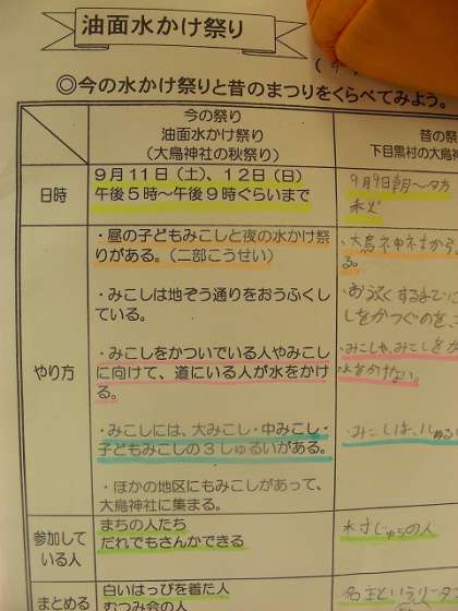 油面地域の祭りについて、昔と今の相違点や共通点を調べています。