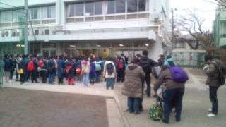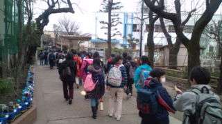 7:50わかたけ学級と本校の6年生が遠足に出かけます。まず、玄関前に集合したり、話を聞き出発しました。