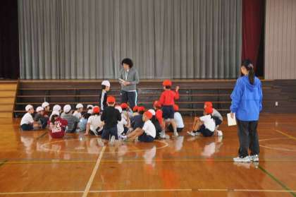 今日はこれまで練習してきたなわとびのできるようになったとび方を見てもらいます。まず、その進め方を聞いています。