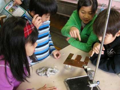 金属板に蝋を塗って、金属のあたたまりかたを調べました。