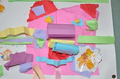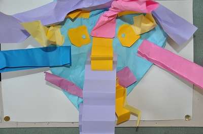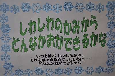 1年生が図工の時間に作った「しわしわのかみから、どんなかおができるかな」の作品が廊下に掲示してあります。その一部を紹介します。