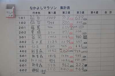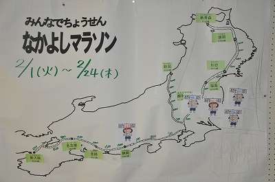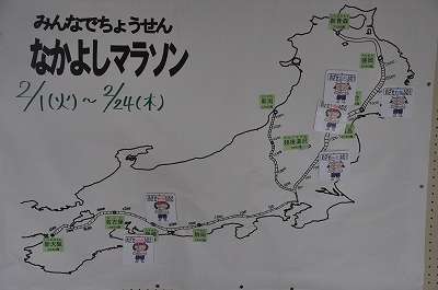 なかよしマラソンも3週が終わり、各学級共に目的地に近づいています。どこまで進んだかは、マラソンガールが地図上で教えてくれています。