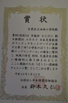 2月14日(月)の児童朝会で紹介した油面住区の皆様といっしょにおこなった4年生の安全マップ作りに対する表彰状です。