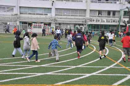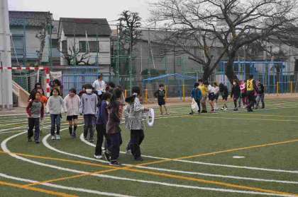 なかよしマラソンも、最後の週を迎えました。最初、トラックの周りを歩いてから音楽に合わせて走り始めます。体育委員会の子どもたちが、走っている間にぶつからないようにコースを示しています。