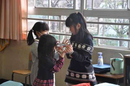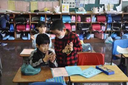 1年生と2年生が4つの教室に分かれて、むかしあそびをいっしょにする交流をしました。この教室ではあやとりで交流しています。2年生が1年生に教えている姿はほほえましかったです。