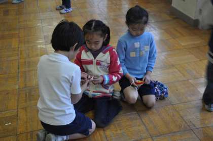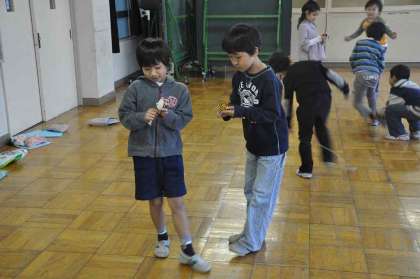 1年生と2年生が4つの教室に分かれて、むかしあそびをいっしょにする交流をしました。この教室ではこまで交流しています。2年生が1年生に教えている姿はほほえましかったです。