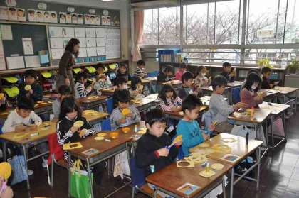 新1年生のために、教室を飾るタンポポの部品を作っています。はさみを上手に使っています。