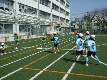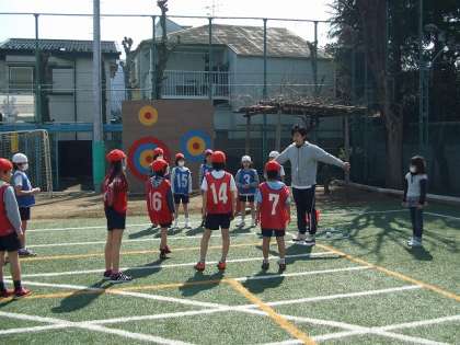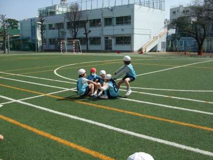 今日は、打者は自分でトスした球を手で打ち返しました。打ったら1塁に走り、1塁についたらホームに戻るといった往復をします。守備側は打球を全員で追って捕った人の周りに手をつないで円を作ります。守備側が円を作る前に、打者が1塁からホームまで往復できたら1点が入ります。逆に、できない場合は点が入りません。