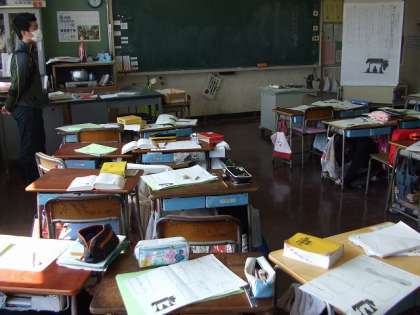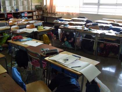 午前11時45分頃、授業中に地震が起きました。子どもたちは慌てることなく冷静に机の下に隠れました。