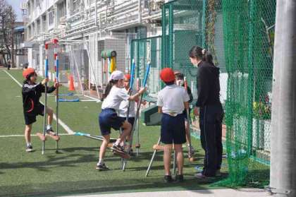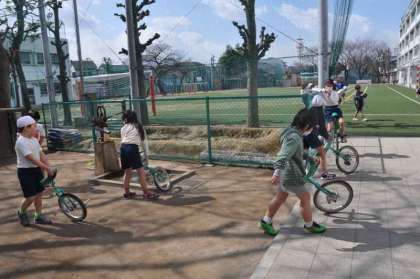 用具を使った運動として、一輪車と竹馬を交代で使っています。