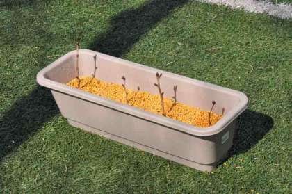 代表の児童が、桜の枝をプランターに植えています。