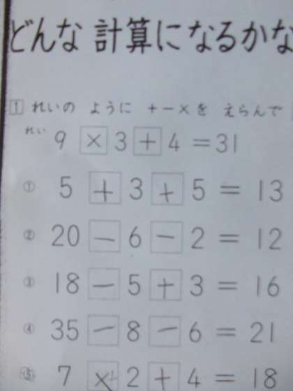 □の中に「+」「−」「×」を入れて答えを導きます。