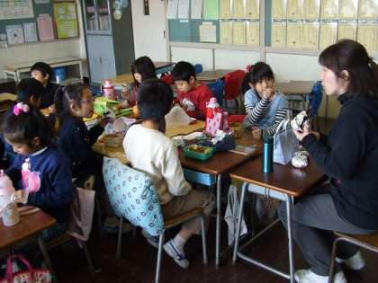 1年1組では長い列を作って食べています。