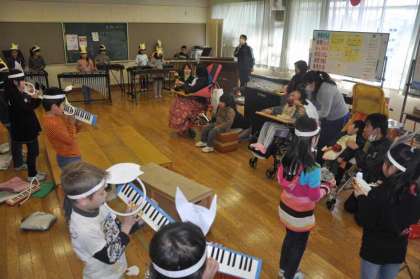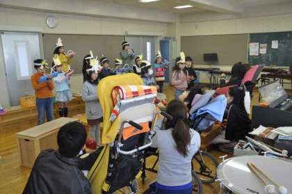 2年生が歌を歌いました。わかたけの子どもたちが楽器で応援しました。