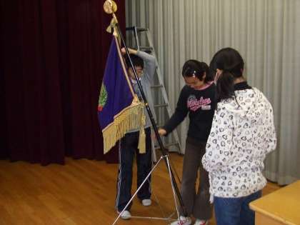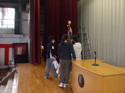 卒業式の準備をしています。重い校旗をみんなで運びました。