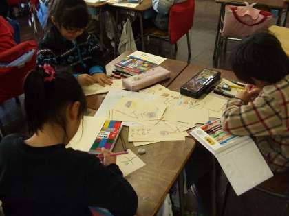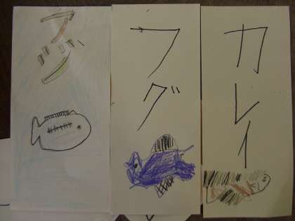 班ごとにお店屋さんを決めて、商品名と絵をかいています。