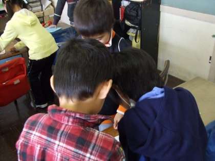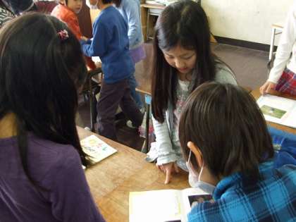 成長の記録をまとめたものを友達と見合っています。