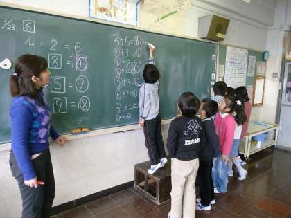 算数の答え合わせをしています。答えを黒板に書いています。