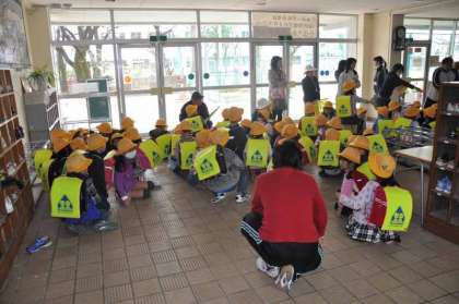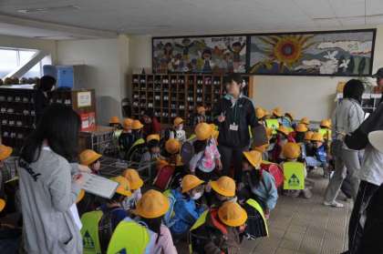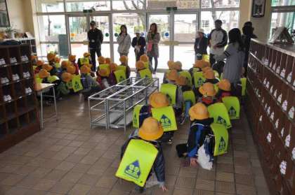 1年生が下校のために昇降口に集まりました。まず、下校で大切な話を聞いています。下校指導については、担任、学童擁護、学童クラブが連携して1年生の安全を守ります。