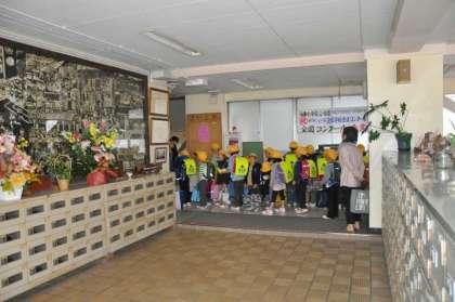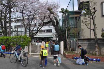 ビオトープ横に桜も花が増えてきました。その下を子どもたちが登校しています。