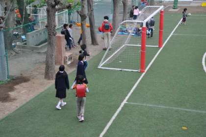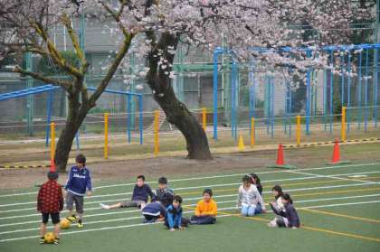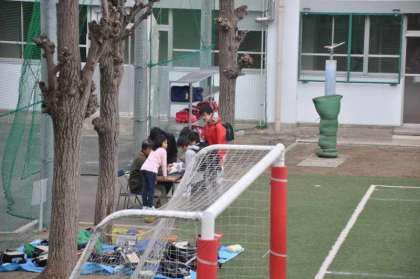 今日もランドセル広場をおこなっています。中には、桜の木の下でお花見をしている子どもたちもいます。3月に卒業し中学生になった子どももあいさつに来てくれました。