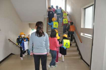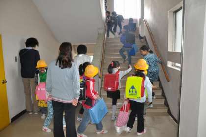 1年生が階段をのぼり、教室に向かっています。