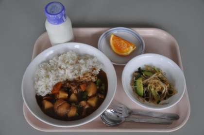 進級おめでとうございます。今日のメニューは人気のカレーライスです。新しい学年になって初めての給食です。友だちと楽しく食べましょう。