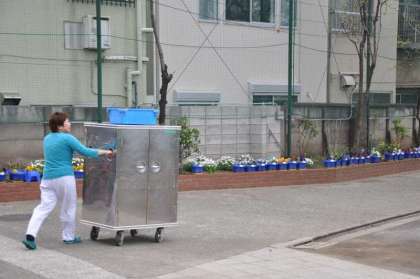 ※写真の運ばれているコンテナーの中には、わかたけ学級用の給食が入っています。