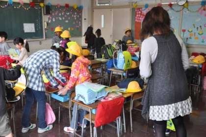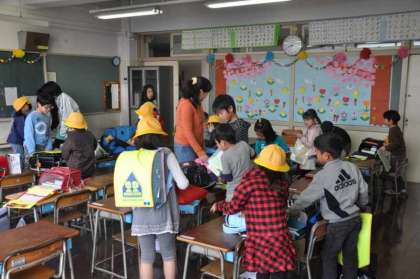 登校後の1年生の教室です。先週に比べ、1年生も6年生も慌てることなく、落ち着いて荷物整理とそのお手伝いをしています。6年生の子どもたちの顔が優しさに満ちています。