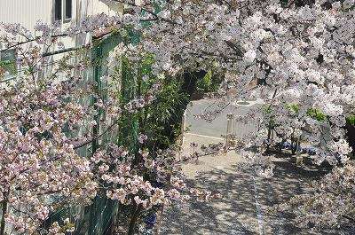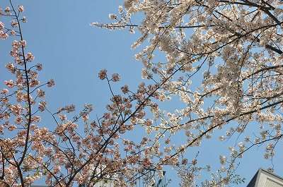 ソメイヨシノと八重桜が隣同士で咲いています。
