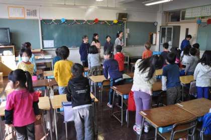 朝、始業前に6年生がゲームをしてくれています。1年生もよくお話を聞いています。