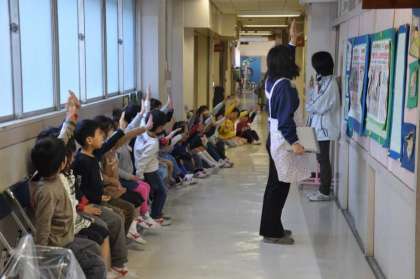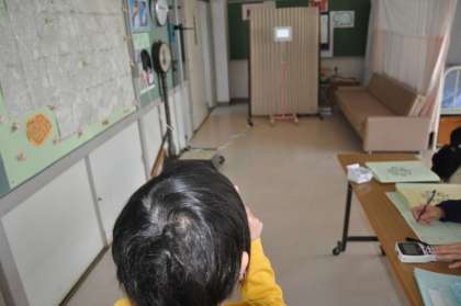 学校で初めての視力検査です。やり方を聞いたあと、検査を始めました。