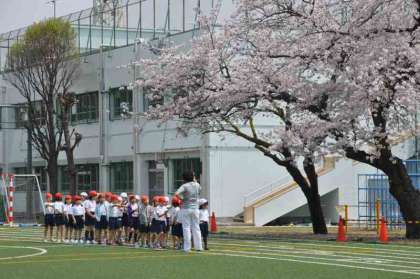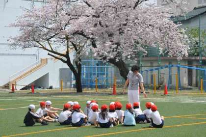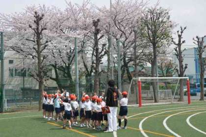 先生の合図で、決められた場所に並ぶ練習をしています。