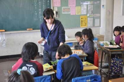 教室でキャベツの苗を観察しています。