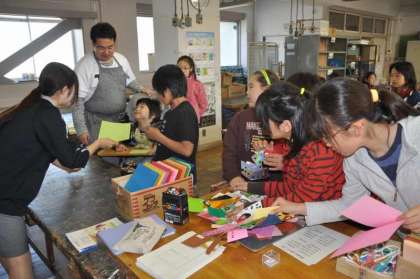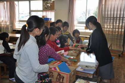 明日の1年生を迎える会で、1年生にプレゼントをする校歌の歌詞カードを仕上げています。わかたけの5年生もいっしょに活動しました。