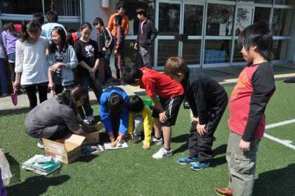 みんなで協力して、ジャガイモの植え付けをしています。