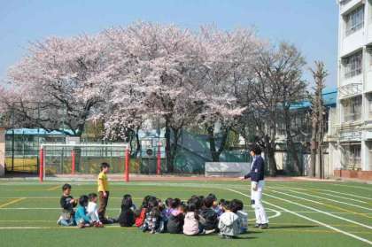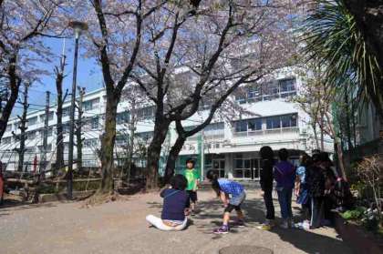 満開の桜を背景に、クラスで使う写真を撮っています。