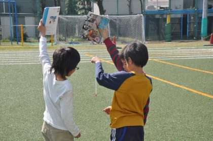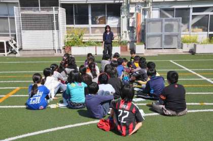 温度計を使い、気温を測ります。温度計に直射日光が当たらないように工夫しています。