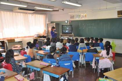 1年生を迎える会の「よびかけ」が間もなく始まります。その前に、入学式の呼びかけのビデオを見て、「今日もがんばるぞ。」と、意識を高めています。