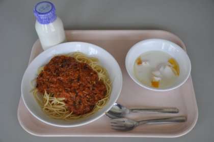 今日は1年生が初めての給食です。油面小の子どもたちに人気のスパゲティーミートソースにしました。さらに、フルーツヨーグルトにラッキースターパイナップルを入れました。