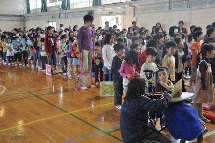 全員で校歌を歌いました。歌詞カードは5年生が作ってくれました。