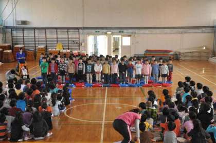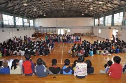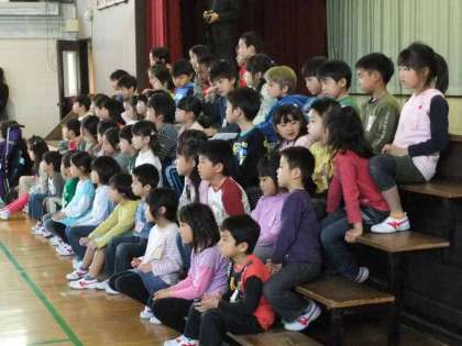 全校児童の代表で2年生が歓迎のことばをプレゼントしました。聞いている1年生はうれしそうです。