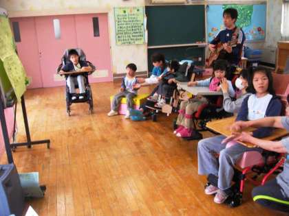 集会室でみんなで歌を歌っています。