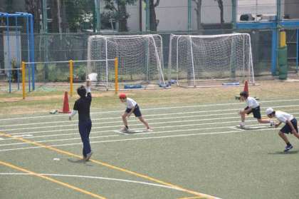 今年から健康トレーナーが変わりました。初日の今日は6年生の体育の授業を支援しました。