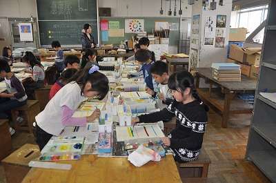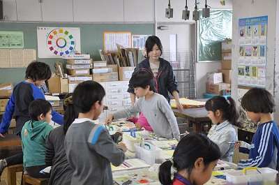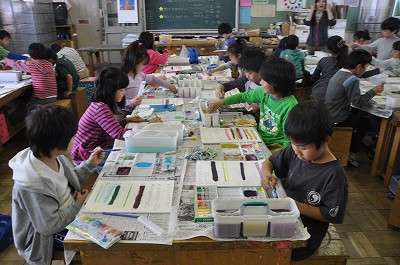 実際に絵の具と筆を使って、太さの違う線を描いています。