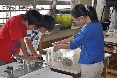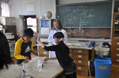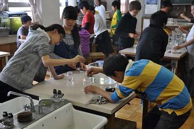 燃えた後のびんに残っているものを調べています。